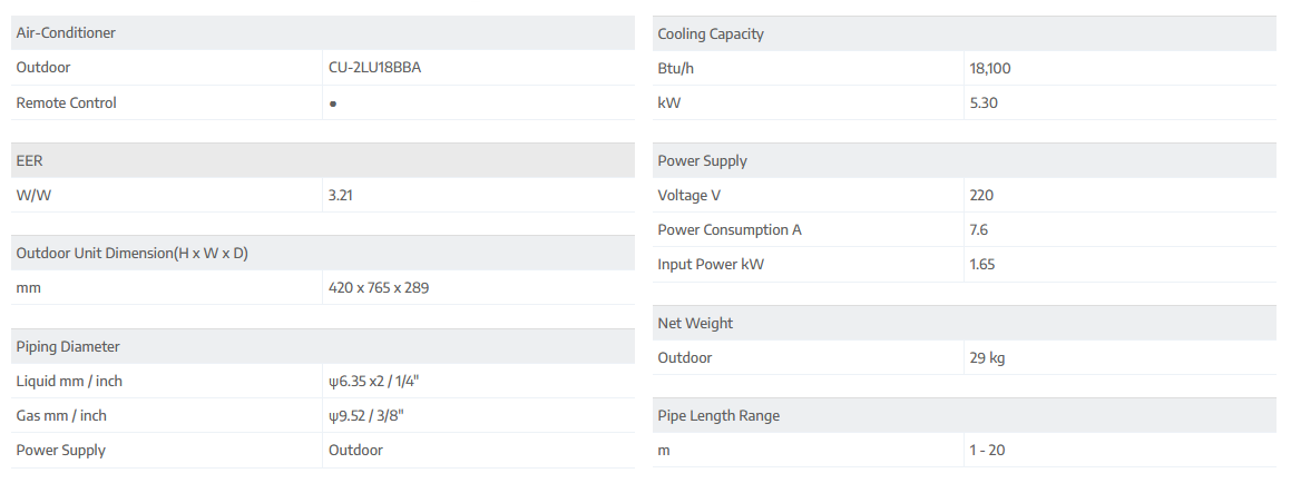 Panasonic CU-2LU18BBA Smaller Multi-Split Inverter Type Air-Conditioner (Outdoor Unit) (2HP)