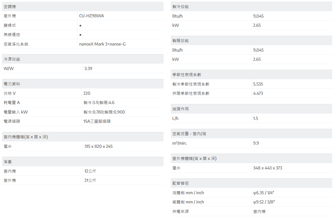 Panasonic 樂聲牌 CS-HZ9BWA Wi-Fi 變頻冷暖窗口式分體空調機 (1 匹)