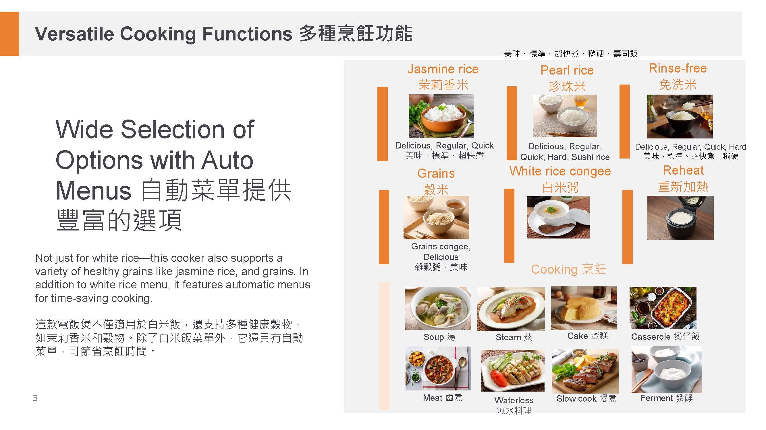 配備8個自動菜單,支持多樣烹飪,包括白米、茉莉香米、穀物、粥、湯、蒸、蛋糕等。
